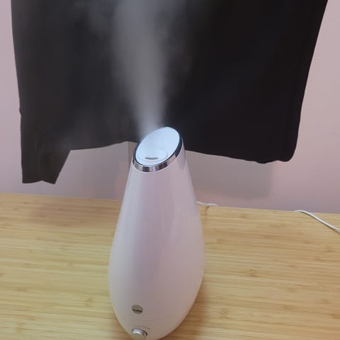 Valkoinen, Wilfa-merkkinen ilmankostutin. Kolme painiketta: päälle/pois, höyryn säätö (pieni tai isompi määrä) sekä valo (kätevä pimeässä huoneessa).