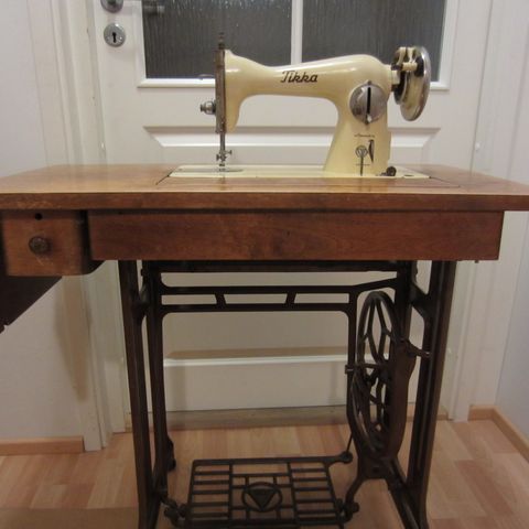 Phoenix ompelukone pöytämallissa, musta runko, mekaaninen käyttö. Sopii ompelutöihin ja korjaamiseen. Pöytäosa valmistettu puusta, jossa metallirunko. Pöytäosan viilutus reunasta vähän auki.