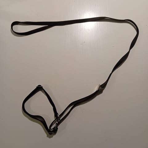 Ruskea näyttelyhihna, jota käytetty vain muutaman kerran. Metallinen kiristysosa ja metallinen "nivel". Pituus 150cm