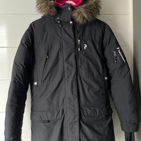 Peak Performance -merkkinen naisten pitkä parkamallinen toppatakki. Erittäin lämmin. Irroitetta karva hupussa. Kiristysnyörit vyötäröllä, takin sisäpuolella. Erittäin vähän käytetty. Muita moitteita kunnosta en löydä, kun vetoketjun alkupäässä olevan pienen repeämän (kts. kuvat). Näppärä korjaa. Itseä ei ole häirinnyt, eikä vaikuta käyttöön, vetoketju itsessään täysin ehjä. Malli FI W KLOND P (Klondyke parka). Koko xs, mutta väljän mallinsa vuoksi sopii hyvin S-kokoisellekkin.