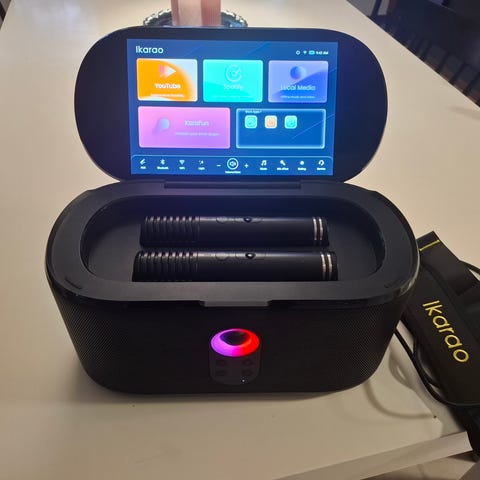 Karaokelaite, jossa musiikkiin reagoiva monivärinen LED-valotehoste ja hauska suihkulähde.