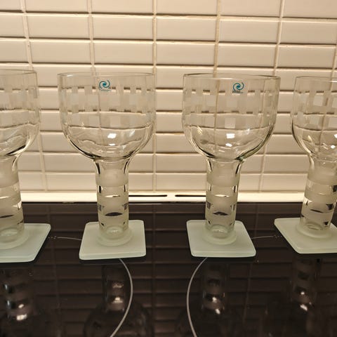Evolum merkkiset kuviolliset juomalasit. Tehty vanhoista pulloista: https://evolum.fi. Kuviot hiekkapuhallettu
