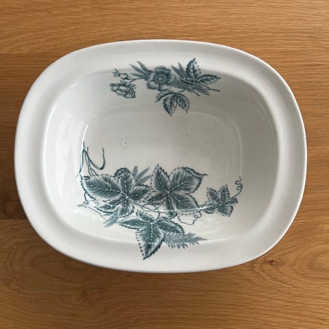 Arabian vihertävä syvälautanen rotanhäntä-leimalla (1900-1920). Hieman krakeloitumaa mikä näkyy kun suurentaa kuvaa.