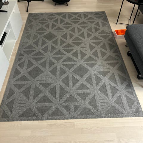 Tummanharmaa matto koko 160 x 230. Suoraan lattiasta, ei pesun jäljiltä, mutta ei mitään silmiinpistävää likaa näkyvissä. Tampere Hallila