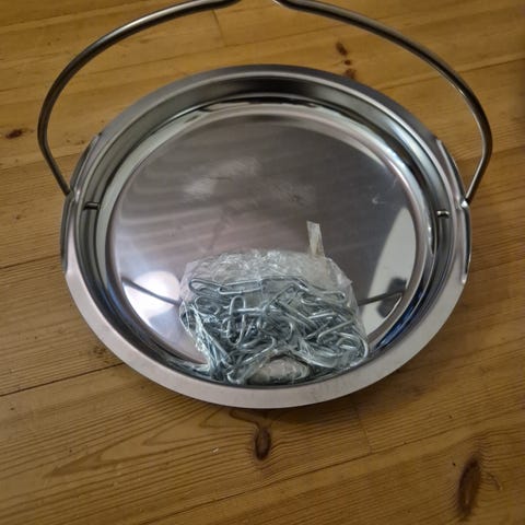 Kiukaan päälle makkaralautanen/kiuaslautanen. Laita ketjulla tarpeeksi lähelle kiuasta ja kuumuus kypsyttää nakit, lihapullat ja makkarat, mitä haluat, kiukaan lämmössä. Pari kertaa käytetty, folioon käärittynä ruoka ollut. Mukaan pitkä ketju ja koukku.