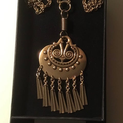 Käytössä ollut Kalevalan iso pronssinen Kuutar-kaulakoru. Ketjun pituus n. 70 cm. Rasiaa ei ole. Pakettiautomaattilähetys Manner-Suomeen 6 euroa, josta saa lähetyksen seurantanumeron. Nouto Kuopiosta keskustasta. Jos ostat kolme (3) myyntikohdettani, maksan pakettiautomaattilähetyksen Manner-Suomeen.