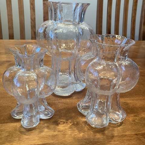 Myydään ruotsalaisen Kostan kirkkaat vintage maljakot. Suunnittelija Vicke Lindstrand. Isomman korkeus 33cm, pienemmän 24cm.