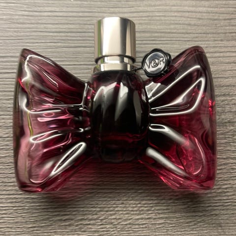 Viktor & Rolf Bonbon Eau de Parfum, 50 ml. Tuoksu on pakattu rusetin muotoiseen pulloon, jossa on kirkkaan purppuranvärinen lasi ja hopeanvärinen korkki.