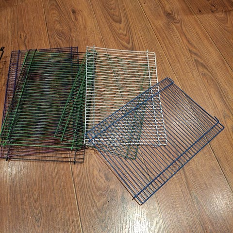 Näistä saa hyvän häkin tai häkkejä koottua. Itsellä ollut näissä lintuja, mutta sopii muillekin pieneläimille. Palasia taitaa olla kahdesta eri häkistä, mutta olen koonnut näistä ison yhden ison häkin.