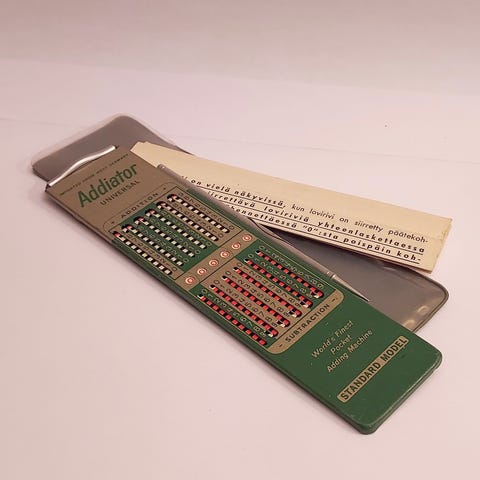 Taskulaskin ajalta ennen elektroniikkaa! Kaksipuoleinen. Mukana kotelo, ”kynä” ja ohjeet. Addimult -merkkinen