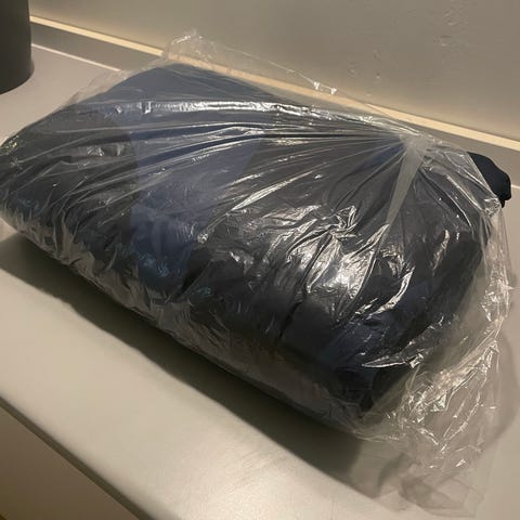 Sininen ja musta peite, Marimekon Finnarille tekemä peite , jota businessluokassa käytetty. sopiva kodin sisustukseen tai vuoteen päällysteeksi. Kuvassa salama vääristää valoa, ei ole yhtään virttynyt. Siisti.
