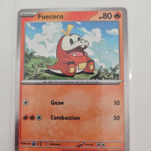 Pokémon Fuecoco keräilykortti, 80 HP, sisältää hyökkäykset Gnaw (10 vahinkoa) ja Combustion (50 vahinkoa). Kortti on osa Pokémon-korttipeliä ja soveltuu keräilyyn sekä pelaamiseen.