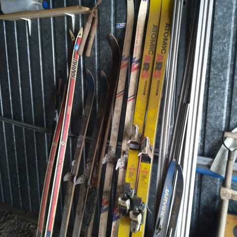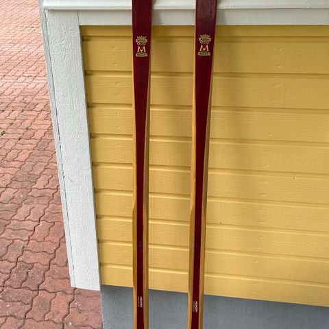 Vanhat puiset sukset, puusukset, ja tarvikkeita. Sukset n 210cm, jalkaosassa lukee "kapea", sauvat n 130cm.