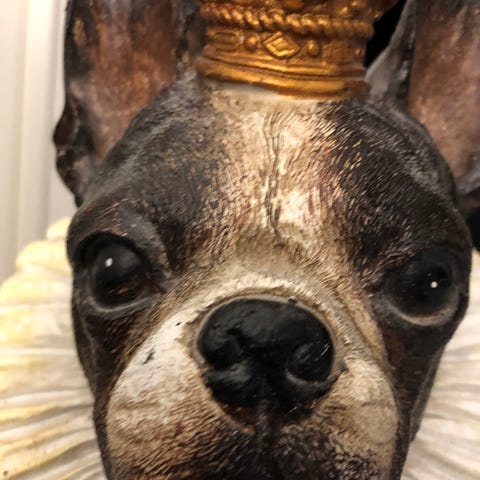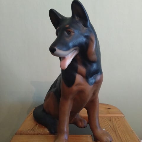 Sympaattinen ja söpö koirapatsas koristeeksi kotiin tai puutarhaan! Koiran korkeus n. 25-30cm. Sisältä ontto.