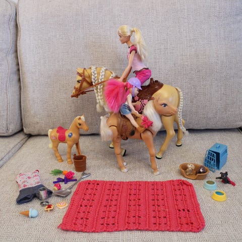 Erittäin hyvä kuntoinen Mattel Barbie Hugs 'n' Horses leikkisetistä Barbie-nukke, Chelsea-nukke, hevonen, poni, koira, aitaus ja varusteita. Nukkejen jalat taipuvat ja Barbien kädet myös. Hevosen ja ponin päät liikkuvat ylös alas.
