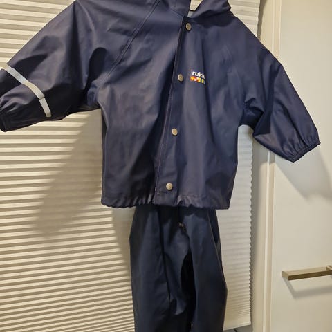 Tummansininen Rukka-sadeasu koossa 86. Hyvä käytetty kunto, jalkalenksut tallella. Pesty juuri käsin.