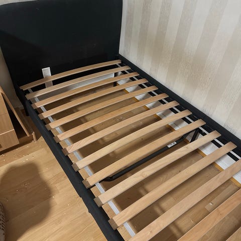 SLATTUM-sängynrungossa on pehmeä verhoilu ja pehmustettu sängynpääty, jotka täydentävät tyylikästä ja yksinkertaista ilmettä. Helppohoitoinen sängynrunko, joka on kätevä kuljettaa kotiin, sillä koko runko on yhdessä pakkauksessa. Sängyn lauta on katkennut. Muutama ruuvi on pudonnut.