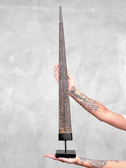 Suuri käsin kaiverrettu härän pää, jonka ovat kaivertaneet taiteilijat, jotka ovat siirtäneet muinaisen kaiverrustaidon isältä pojalle.