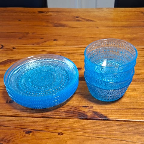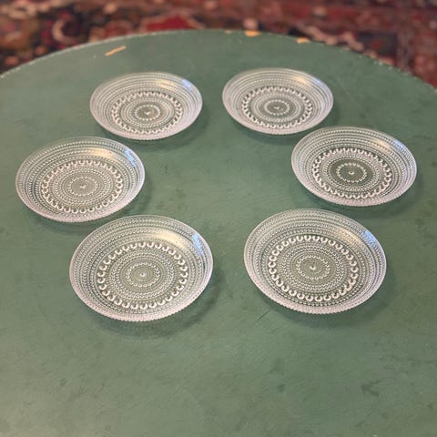Myytävänä 5kpl Oiva Toikan Nuutajärven lasille suunnitteleman Kastehelmi-sarjan kirkkaat lautaset. Lautasten halkaisija on 140 mm. Myynnissä olevat lautaset ovat ehjiä. Hinta yhteensä 40€