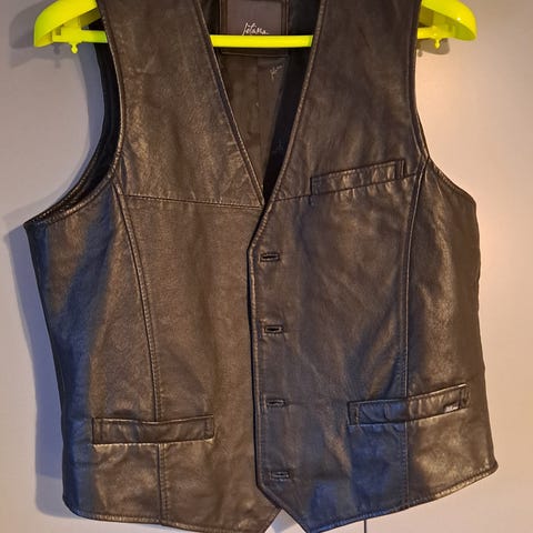 Punainen nahkaliivi aitoa mokkanahkaa. Takapuolelta muuta materiaalia. Vintagea merkki Mariah.