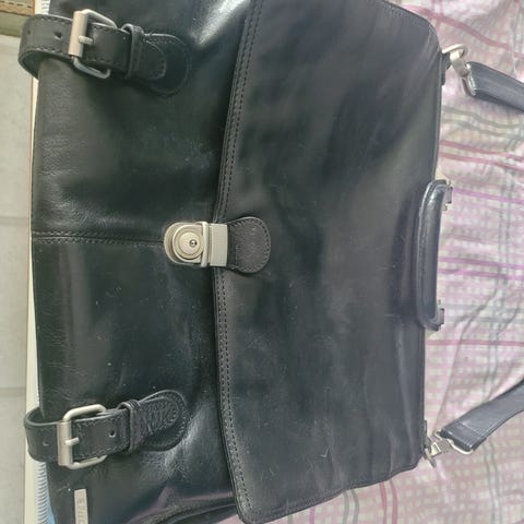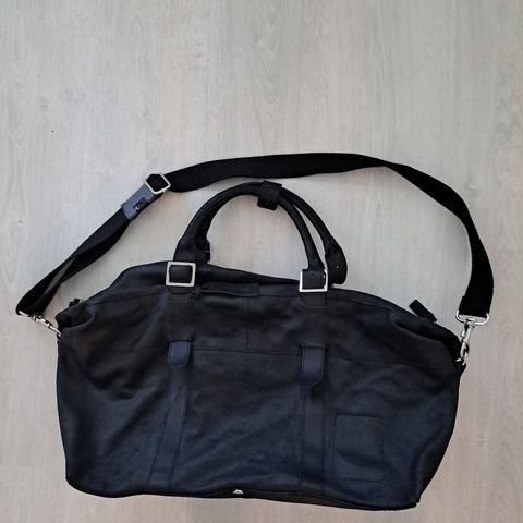 Miesten nahkalaukku mustaa aitoa nahkaa (520 x 300 x 195 mm). Vetoketjukiinnitys. Ulko- ja sisätaskut vetoketjulla, olkahihna.