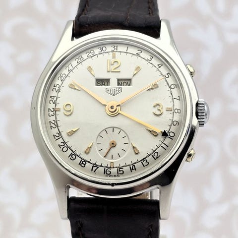 Käyttöön tai keräilyyn! Alkuperäisessä laatikossaan oleva Heuer Leonidas on varsin näyttävä kokonaisuus.