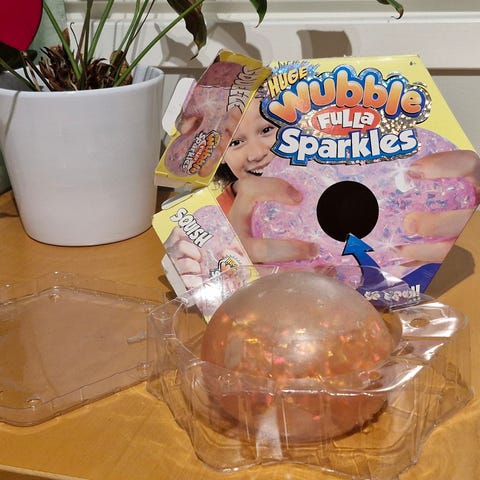 Big Wubble Fulla Sparkles -lelu. Puristeltava, venyvä ja pehmeä pallo, joka on täynnä kimaltelevia hippuja. Kooltaan n. 10 cm. Käyttämätön, paketti avattu vain kuvan ottamista varten. Mukana käyttöohje.