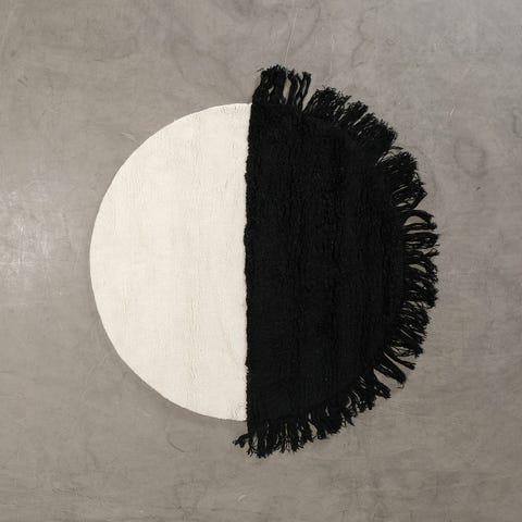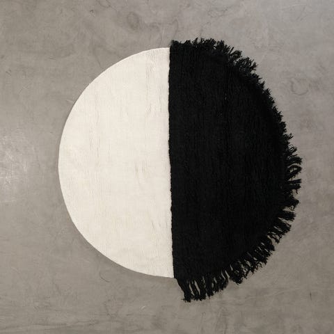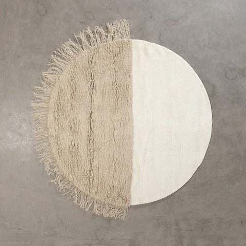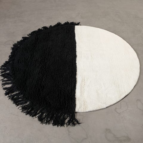 Woven Worksin pyöreä Arc-matto hurmaa persoonallisella muodollaan, ihanalla tekstuurillaan sekä leikkisällä sävyjen kontrastilla. Laura Seppäsen suunnittelema matto on kudottu lämpimästä ja pehmeästä Uuden-Sellannin villasta.