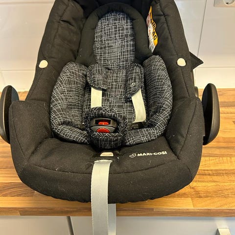 Kahdella lapsella käytössä ollut maxi cosi turvakaukalo. Siisti kuntoinen ja kankaat juuri pesty uutta käyttäjää varten.