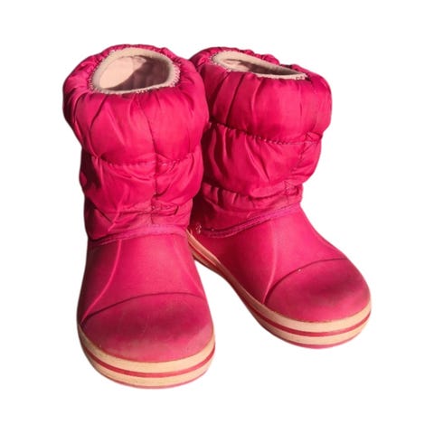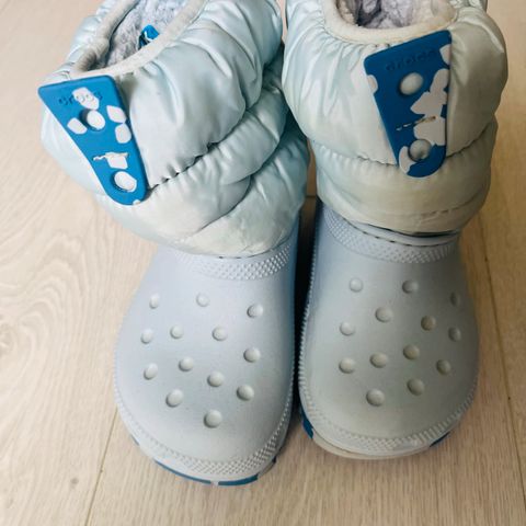 Siniset Crocsin loskasaappaat, koko C8 (vastaa 24-25). Ehjät ja siistit, varressa vähän likaa ja sisävuori aavistuksen nukkaantunut.