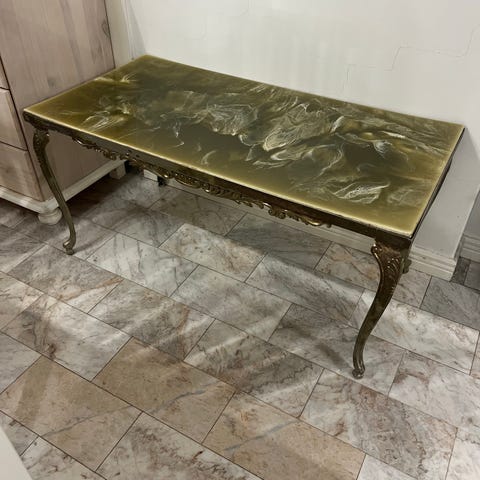 Upea sarja pahkasta; peili (koko 60 x 108 cm. Peilin pinta loistava! Pöytä ( korkeus 46 cm, halkaisja 45 x 70 cm. Pöydän pinnan voisi lakata uudelleen.