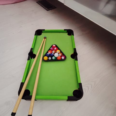 Myynnissä halvalla Mini biljardipöytä, koska käyttöä sille ei enään ole. Pöytä on hyvässä kunnossa. Mukaan tulee pallot, kolmio ja yksi maila. Pöytä on 50x30cm. Vain nouto!