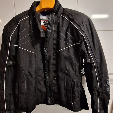 Sweep naisten moottoripyöräasun takki. Takin koko 38. Ollut päällä 155cm henkilöllä. Takki on väritykseltään valkoinen ja musta. Materiaalina on kestävä kangas, jossa on CE-hyväksytyt suojat kyynärpäissä, olkapäissä ja selässä ja ne on suunniteltu tarjoamaan suojaa moottoripyöräilyyn. Käy varmasti myös kelkkailuun.