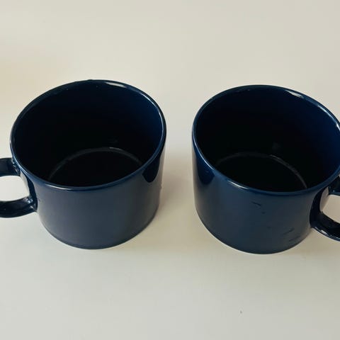 Iittala siniset kahvimukit, yht 4 kpl. Hyvässä kunnossa muuten, mutta kahdessa mukissa hieman kulumaa yläreunassa (näkyy vikassa kuvassa) yht 20 €