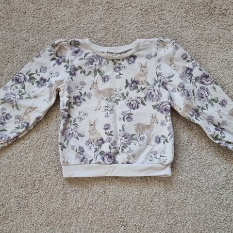 Hyväkuntoinen Newbie collegepaita koko 98/104, ollut kylläkin meidän pitkäselkäiselle koossa 86/92 hyvä. Hihassa ruskea läikkä joka ei näy yleisilmeessä mutta kuvissa myös lähiotos siitä.