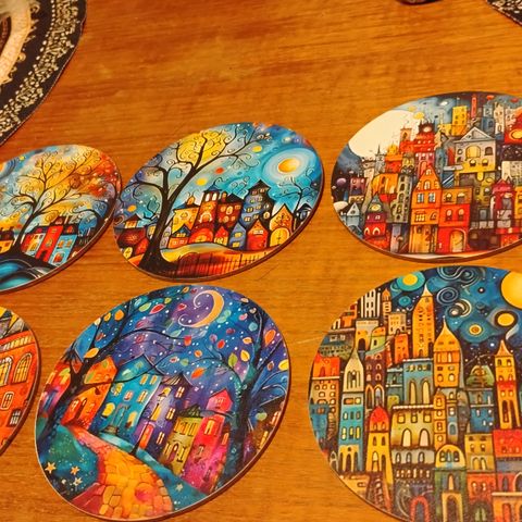 Matkamuisto. 6 kpl juomalasin alusia. Puu ja mahdollisesti alabaster työtä.