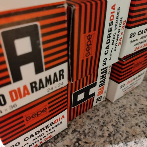 Myydään Gepe lasiset diakehykset 24x36 mm, 3 mm paksuus.