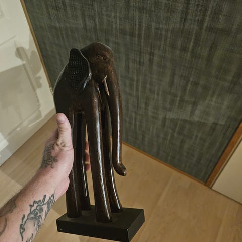Kaksi puista norsupatsasta. Isompi korkeus n 16cm, pituus n 25 cm. Pienempi korkeus n 8 cm pituus 9,5 cm. Myyn mielelläni parina.