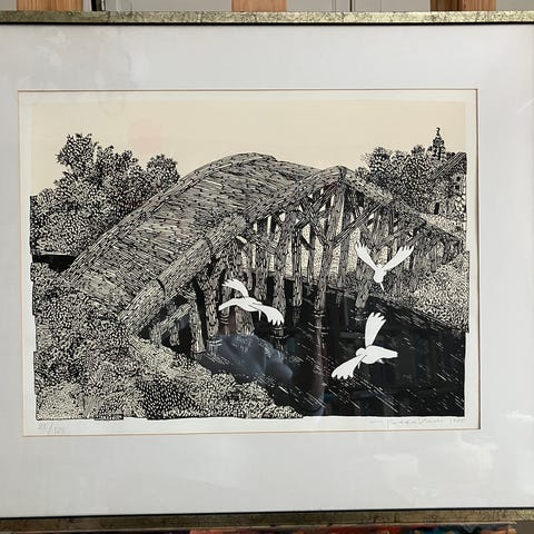 Pekka Vuoren grafiikkateos "Philharmony sisters" v. 1998. 50 x 61 cm, itse teos 47 x 36. Mattahopeakehys metallia. Säilytetty sisätiloissa. Merkintä 150 / 175. Toriviesti, vain nouto.
