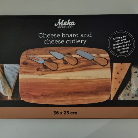 Hollantilainen puinen juustolauta, jossa kuvitettu keraaminen alusta juustolle ja leikkuri. Koko 28,5 × 29,5 cm. Settiin kuuluu Fiskarsin juustoveitsi. Nouto Veräjämäestä tai voin lähettää Toridiilillä.