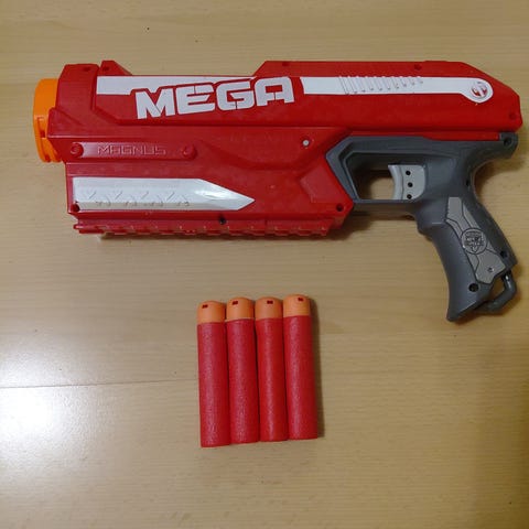 Nerf Mega leluase, joka sisältää kaksi mega luotia. Luodeissa on pientä painautumaa, mutta toimivat moitteettomasti.