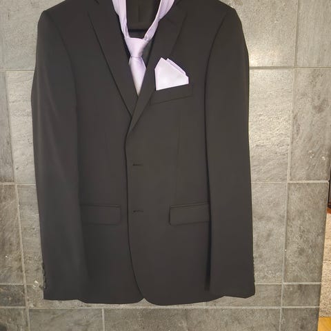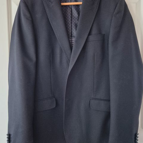 Dressmanista ostettu kerran käytetty puvun takki. Poika kasvoi tästä ulos. Olka-hihansuu 65 cm, hartiat ( olkaauma-olkasauma) 43cm. Lila rusetti kaupan päälle.