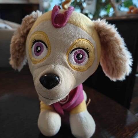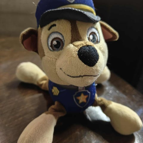 Paw Patrol Chase pehmolelu, oranssi väri, pehmeä materiaali. Sopii lasten leikkeihin.