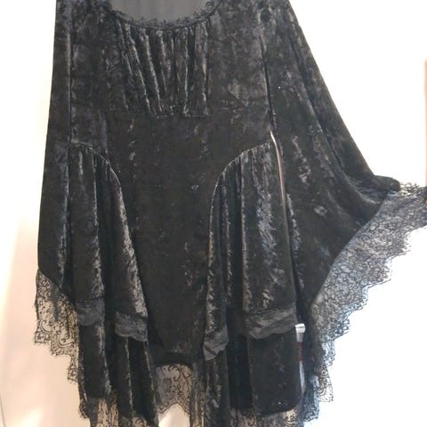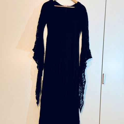 Musta mekko ja koko XXL. Mekossa on pitkä hihainen malli ja siinä on hihansuissa liehuke- tai kellohihat. Mekon pinnassa on hämähäkinseitti-kuviointi.