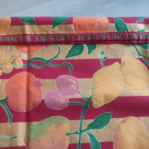 Marimekon pinnoitettua puuvillakangasta. Kuosina on ihastuttava Hacienda vaaleanpunaisessa sävyssä. Tämä on ostettu vuonna 2009 tai 2010. Kankaan leveys on hulpiot mukaan lukien noin 148 cm ja korkeus noin 150 cm. Ensimmäisessä kuvassa kangas on kaksinkerroin.