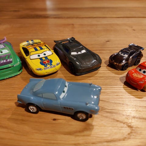 Disney Cars lelusarjan autot Cruz ja Salama autot. Pikkuauto vain esimerkkinä autojen koosta.