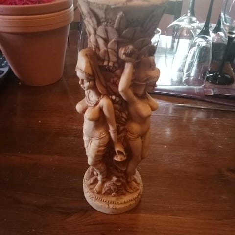 Myydään hevosenkenkänauloista taiteiltu kynttilänjalka/seinäteline. Keskellä kullattu kohta, joka loistaa kynttilän palaessa. Korkeus noin 28cm.