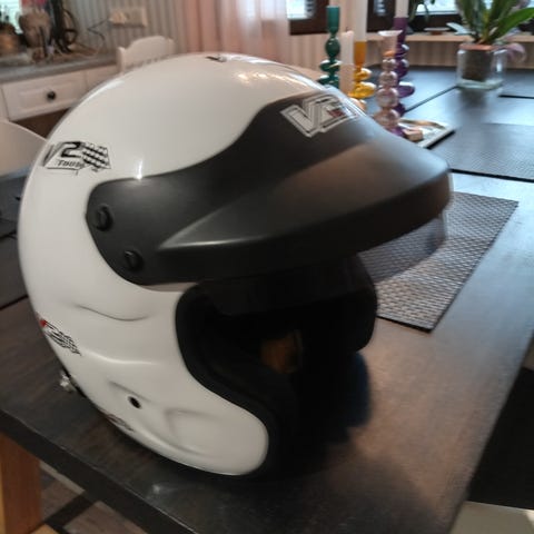 Suomy J19 avokypärä. Väri hopea, musta sisusta. Kypärässä on lyhyt lippa edessä ja useita ilmanvaihtoaukkoja. Sisällä irrotettava tai pestävä pehmuste. Valmistusmaa Italia, tyyppimerkintä A-FR. Mukana suojapussi, jossa Suomy-logo ja kiristysnyöri säilytystä ja kuljetusta varten.