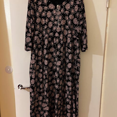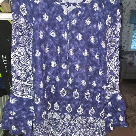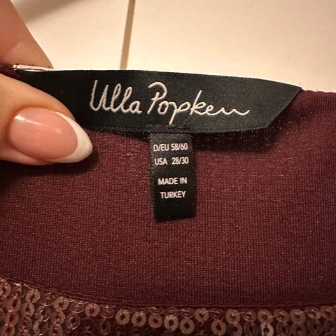 Ulla Popken naisten tunika, koko 46-48, liila-musta simpukkakuvioinen, viskoosikreppi, edessä smokkirypytys, kaula-aukossa nauhat, 3/4 hihat. Vähän käytetty, siisti. Kainalo- kainalo 64cm.