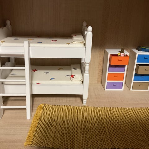 Kaksi puista nukkekodin sänkyä, toinen keltainen ja toinen musta. Itsetehtyjä.
